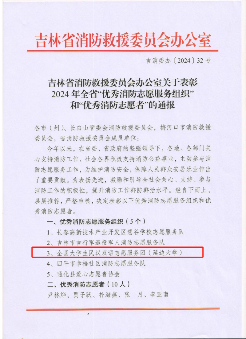 近日,吉林省消防救援委员会办公室通报了关于表彰2024年吉林省“优秀消防志愿服务组织”和“优秀消防志愿者”的决定,我校民汉双语志愿服务团(以下简称“服务团”)荣获2024年吉林省“优秀消防志愿服务组织”荣誉称号。