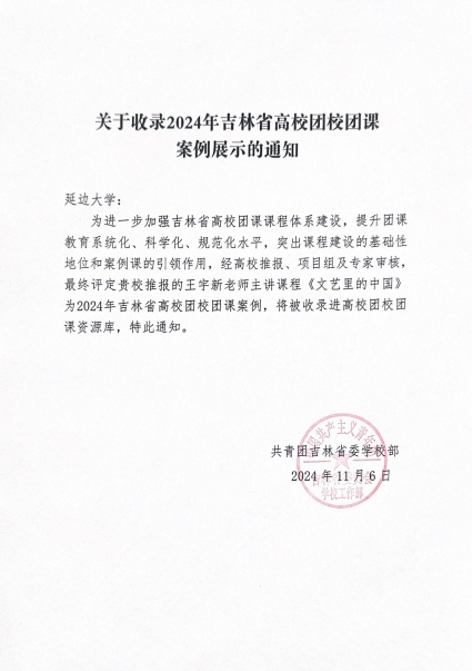 为进一步加强吉林省高校团课课程体系建设,提升团课教育系统化、科学化、规范化水平,突出课程建设的基础性地位和精品课的示范引领作用,进一步提高高校团校教师教学能力水平,努力造就一批对党忠诚、精通党的创新理论、授课水平高、在学科领域有影响力的知名教师,形成提高教学质量、争创精品课程的良好氛围,今年7月起,共青团吉林省委面向全省高校团校征集优秀团课案例,经过校团委初审推荐、吉林省团校教务培训部团校阵地建设项目组及专家组评选,我校艺术学院王宇新教师团队的《文艺里的中国》团课被收录进2024年吉林省高校团校团课案例资源库。