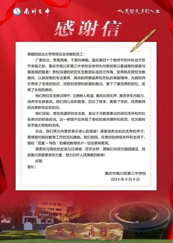 近期,延边大学研究生支教团服务单位重庆市南川区第三中学校向我校发来感谢信。信中对我校在推进当地教育事业高质量发展工作中给予的无私援助致以最诚挚的感谢,向在重庆市南川区服务的我校研究生支教团所开展的教育教学工作给予充分肯定。