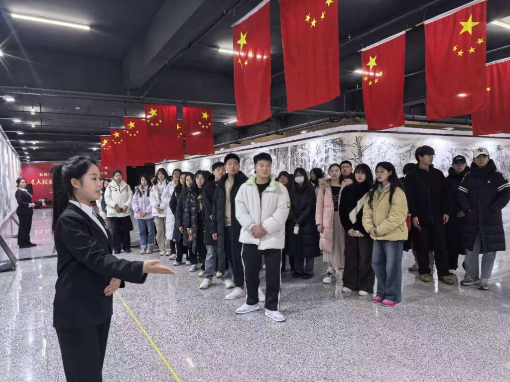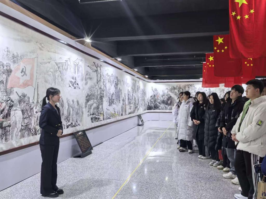 《人民英雄杨靖宇》百米组画高1.949米、全长108米,由《东北沦陷》《发动群众》等13个篇章组成。作品以水墨画为表现形式,全景展现了人民英雄杨靖宇在长白山地区抗击日寇直至壮烈牺牲的全过程。百米组画由吉林省冰雪丝路书画院院长、著名冰雪画派画家赵明仁主创。在画展现场,同学们被气势恢宏的画作所吸引,不时驻足欣赏、交流感受。通过讲解员的讲解,大家更加深入地了解了杨靖宇将军的生平事迹和革命英雄主义精神。
