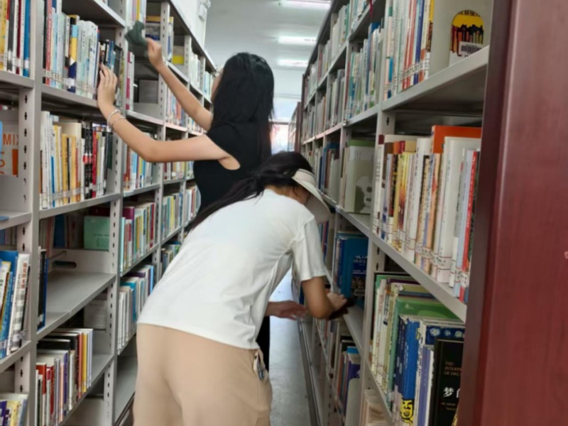 活动伊始,志愿者们迅速投入到各自的任务中。他们细心擦拭书架,将书本摆放得井然有序;俯身清理地面的污渍;认真整理散落的书籍,并按类别重新归置。志愿者们化身 "文化秩序守护者"。面对读书日激增人流量导致的书架错位,循着索书号逐架排查,轻拿轻放间将一本本错位书籍精准归位。遇到被翻阅后随意摆放的图书,志愿者刘昱彤仔细核对书脊信息,耐心送回对应区域.经过志愿者们的共同努力,整个空间变得明亮整洁、井然有序,为广大师生营造了一个更加舒适、洁净的环境。