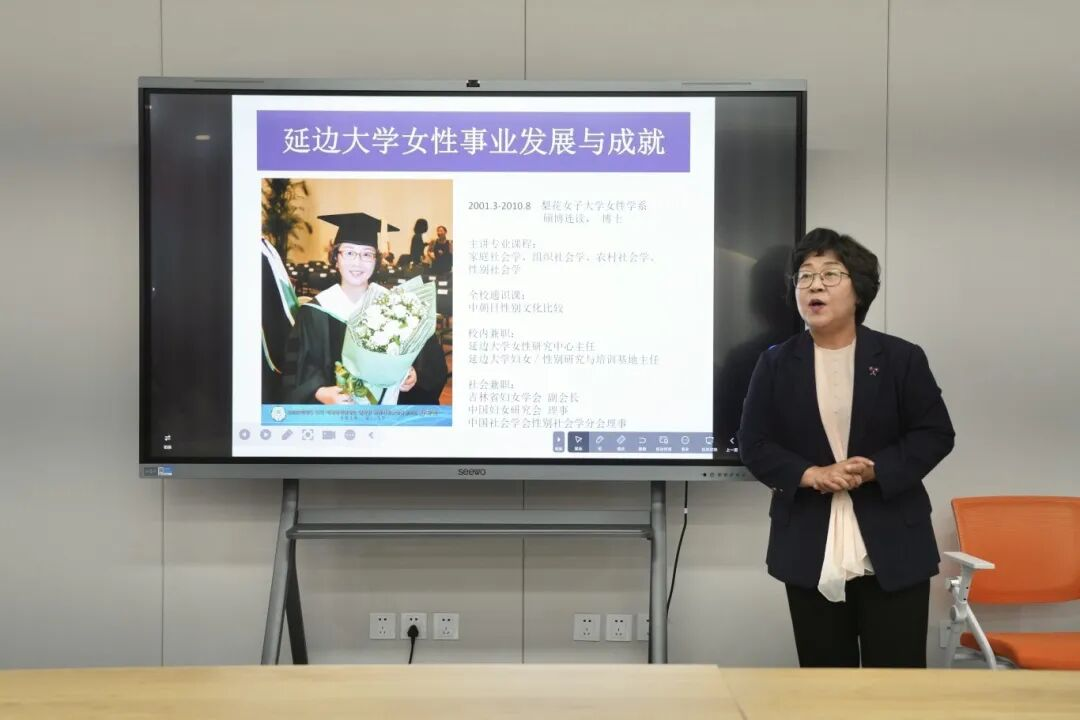 金花善围绕习近平总书记在全球妇女峰会上的重要讲话精神,从理论高度和实践维度进行了深入解读。她深刻阐释了推进妇女事业发展的重大意义,并详细分析了当前妇女事业发展面临的新形势、新机遇。同时,结合延边大学妇女事业的发展,运用社会学、女性学等前沿理论视角,结合国内外最新研究成果与鲜活案例,系统梳理了妇女事业在政策制定、社会参与、经济赋权等方面的创新实践与面临的挑战。通过严谨的学术论证和数据支撑,引导同学们深入思考如何从理论建构、实证研究、制度批判等学术层面,有效推动妇女事业的持续进步与创新发展,极大地拓宽了在场师生的学术视野,加深了大家对妇女事业与创新研究的理解。