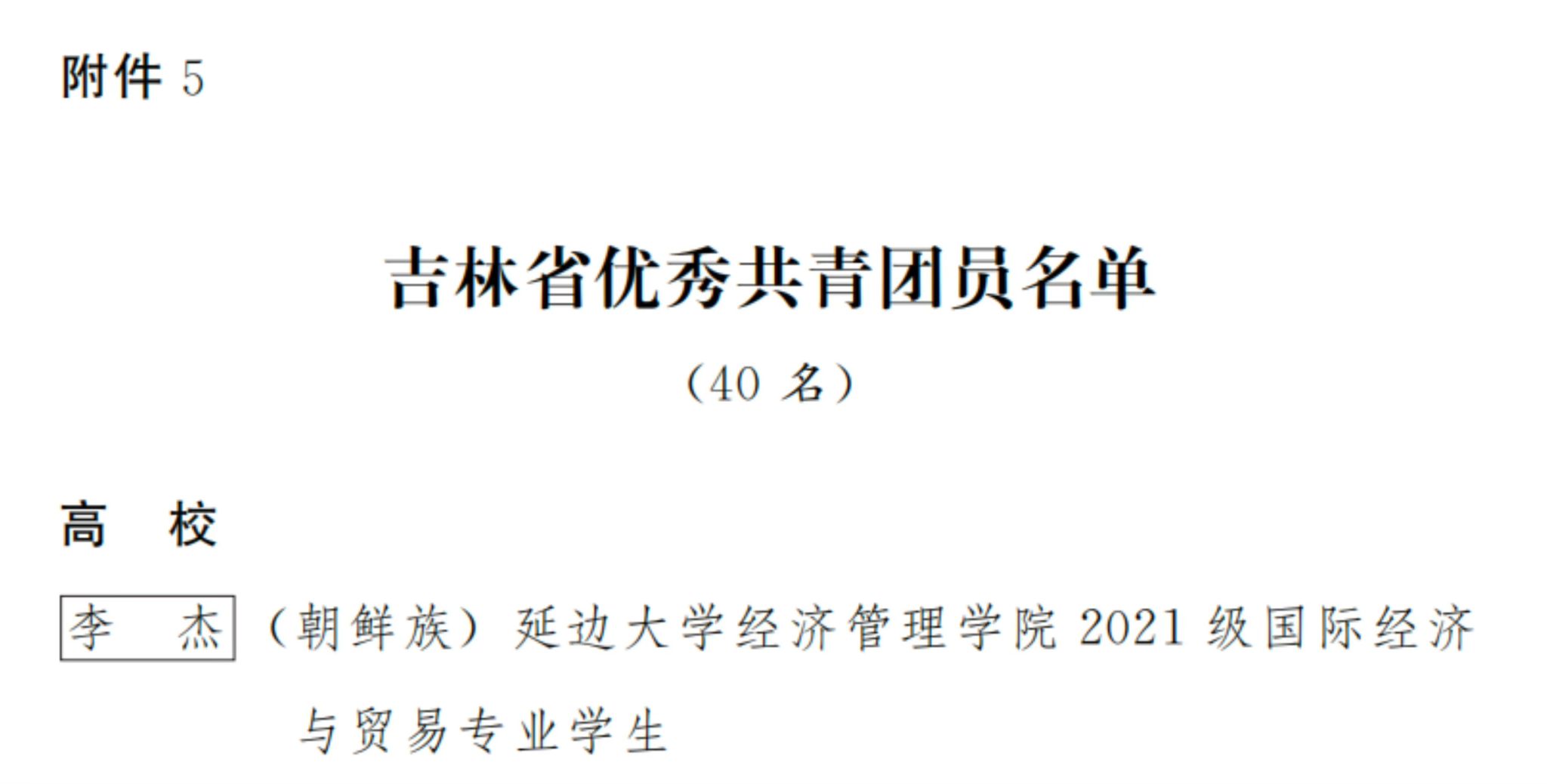 同时,我校经济管理学院2021级国际经济与贸易专业李杰同学(朝鲜族) 被追授为“吉林省优秀共青团员”。2024年5月16日,在公民生命财产安全面临严重威胁的危急时刻,李杰同志毫不畏惧、英勇挺身,以舍生取义的壮烈行动,践行了为人民服务的根本宗旨,展现了当代青年勇于担当、不怕牺牲的崇高品格,最终献出了宝贵的生命。延边朝鲜族自治州人民政府于2024年6月19日追授李杰同志“见义勇为先进个人”荣誉称号;延边大学团委同步追认其为优秀共青团员。2025年9月30日,经严格程序评定,党和国家功勋荣誉表彰工作委员会办公室正式追授李杰同志为烈士。李杰同志的英雄事迹,充分体现了在党的培养下成长起来的新时代青年坚定的理想信念和高尚的道德情操,是践行社会主义核心价值观的生动典范,其精神将永远激励我们奋勇前行。