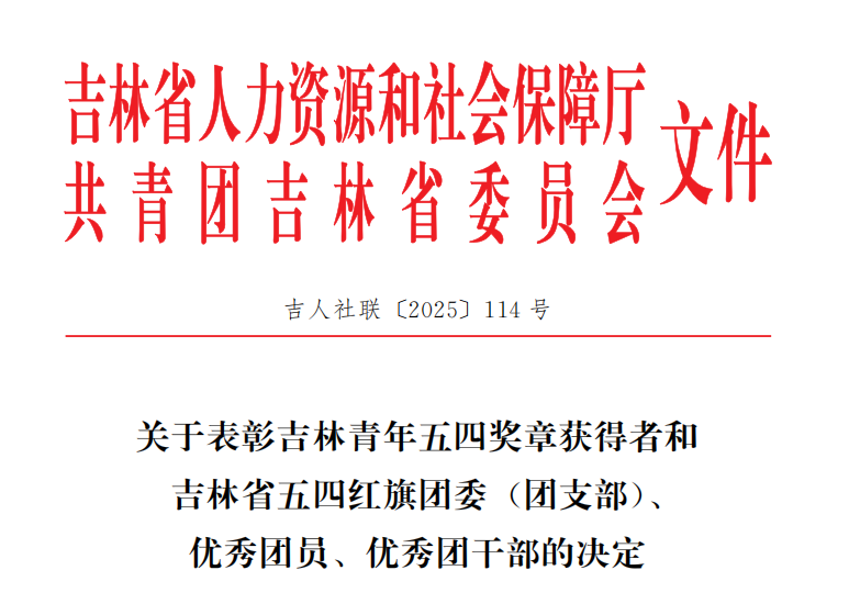 近日,吉林省人力资源和社会保障厅、共青团吉林省委员会联合发布《关于表彰2025年度吉林青年五四奖章获得者和吉林省五四红旗团委(团支部)、优秀团员、团干部的决定》(吉人社联〔2025〕114号)。我校共青团工作喜获两项重要荣誉。