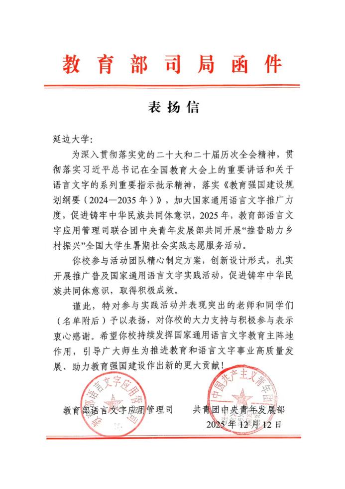 此外,教育部语言文字应用管理司与共青团中央青年发展部特联合向我校发来表扬信,对学校在本次“推普助力乡村振兴”志愿服务活动中展现的高度组织力、突出实践成效及积极社会影响给予充分肯定与高度赞扬。